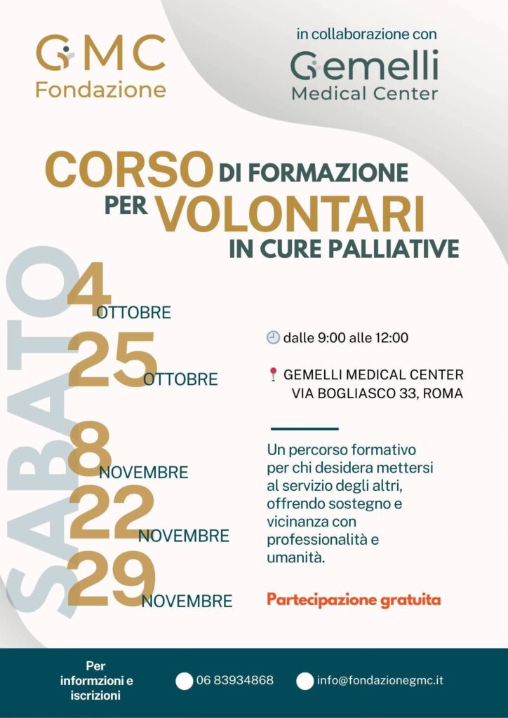 Prenderà il via sabato 4 ottobre presso il Gemelli Medical Center di Roma il nuovo corso di formazione per volontari in cure palliative, promosso dalla Fondazione GMC in collaborazione con lo stesso centro. L’iniziativa, gratuita e aperta a tutta la cittadinanza, nasce con l’obiettivo di formare nuovi volontari capaci di offrire sostegno, vicinanza e umanità alle persone in situazioni di fragilità e alle loro famiglie.
