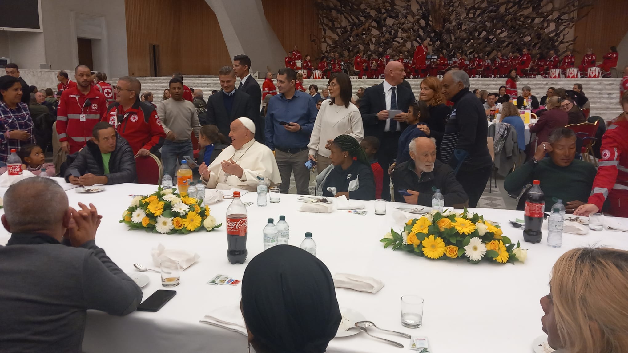 Il cuore della giornata è stato il pranzo conviviale con oltre 1.300 poveri, che si è svolto in Aula Paolo VI, subito dopo la Messa presieduta dal Papa nella Basilica di San Pietro. Il pranzo è stato organizzato dalla Croce Rossa Italiana e ha visto la partecipazione di persone in difficoltà provenienti da tutta Roma. Tra di loro, gli ospiti delle case di accoglienza delle Missionarie della Carità, le Suore di Madre Teresa di Calcutta, che hanno portato con sé i loro assistiti dalle comunità di Casilino, Celio, Tor Bella Monaca, Primavalle e Dono di Maria (questa ultima situata all’interno dello Stato del Vaticano). Le suore, da sempre impegnate nell’accoglienza degli emarginati e dei poveri, hanno ricevuto il supporto e l’accompagnamento dei soci della sezione caritativa dell’Associazione Santi Pietro e Paolo. Quest’associazione, erede della storica Guardia Palatina (sciolta nel 1970), continua a prestare servizi di accoglienza e di ordine durante le funzioni papali e in altre attività di servizio per il Papa e la Chiesa.